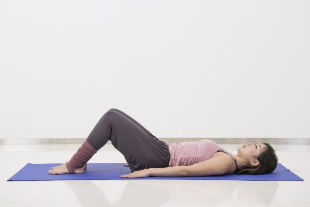 (1)背骨を真っ直ぐにして仰向けに寝て、ひざを立てて腰幅に脚を開く