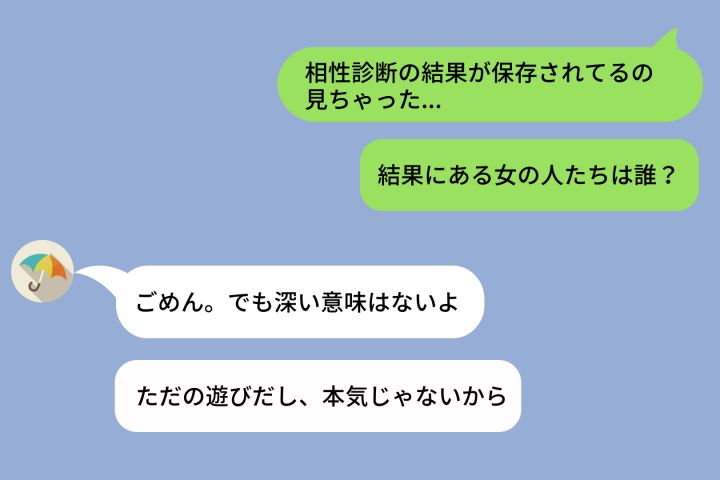 その日の夜、私は思い切って彼にLINEで聞きました。相性診断の保存画面を見てしまったこと、他の女性の名前があったことを。