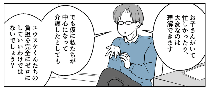 弟は相変わらず介護は無理だと主張し、挙句の果てには夫に手伝うよう言い出しはじめます。