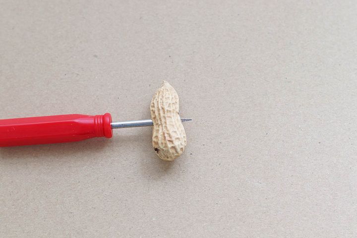 殻つき落花生の割れ目のない真ん中のあたりに、ドライバーで穴を開けます。このとき、下に厚紙や段ボールを敷いておくとよいでしょう。