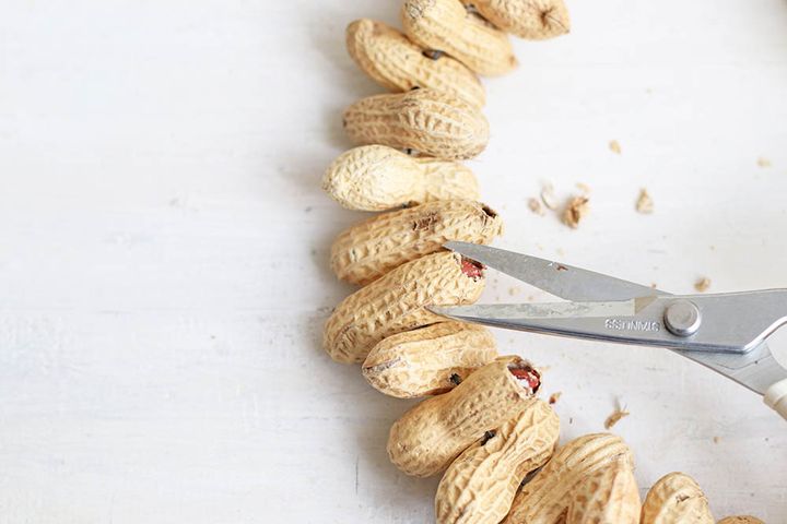 そしてピーナッツに、ハサミで穴をあけていきます。あとは外に飾っておくだけ。