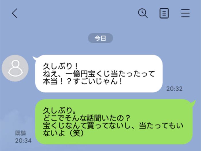 「久しぶり。どこでそんな話聞いたの?宝くじなんて買ってないし、当たってもいないよ(笑)」