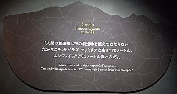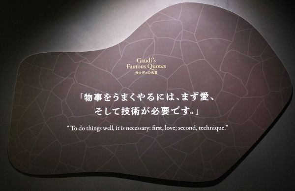 会場にはガウディの言葉「物事をうまくやるには、まず愛、そして技術が必要です。」が。愛と技術の融合がガウディ建築の魅力の原点にあるのかもしれません。