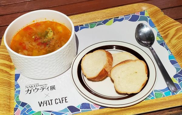 アートギャラリーカフェ「WHAT CAFE」ではガウディの世界観をイメージした展覧会にちなんだメニュー、カタルーニャ風 陽だまりのスープ(1,200円)、カサ・バトリョのチュロス&アイス(800円)をいただきました。