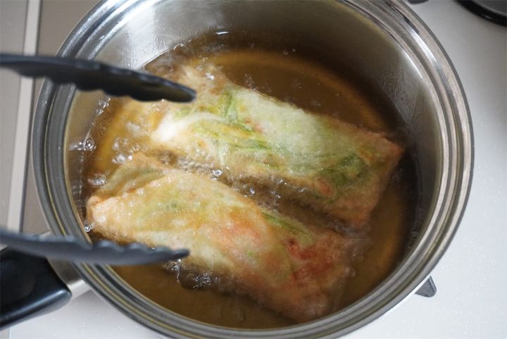 4. 揚げ油を170℃に熱してきつね色になるまで両面を揚げる。