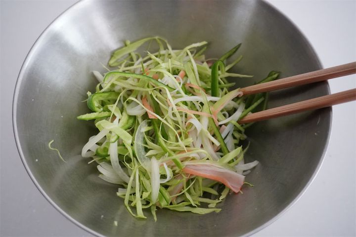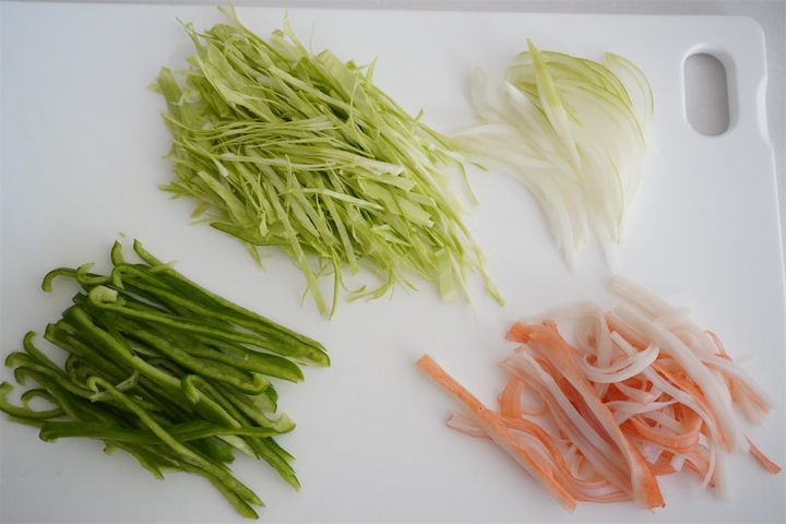 1. キャベツは千切り、玉ねぎは薄切り、ピーマンは細切りにする。カニカマは手で割く。