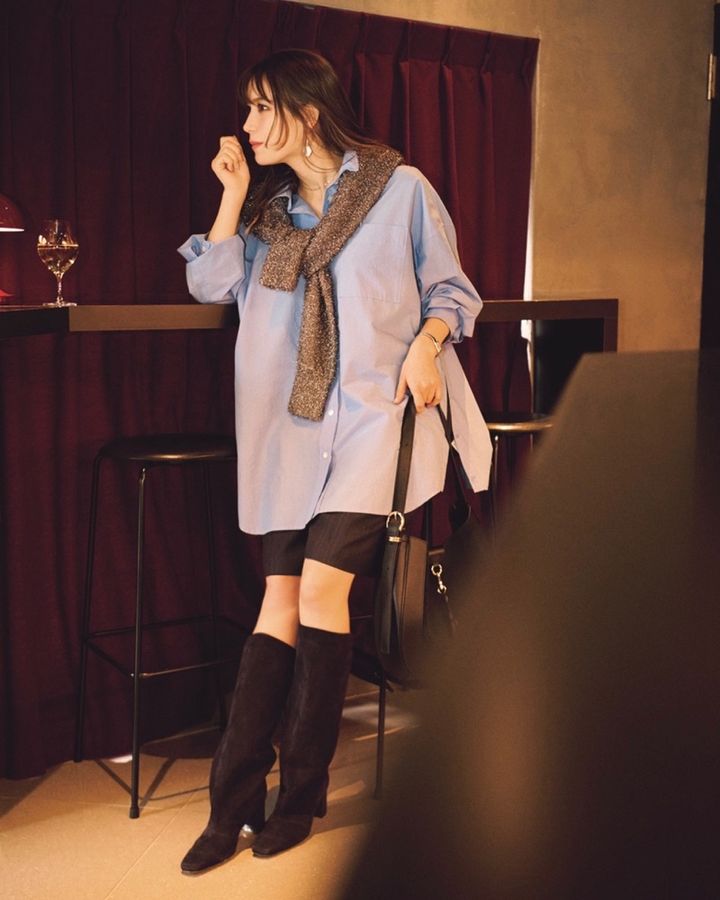 1月30日(金)、オーバーサイズのブルーシャツには、ショートパンツを合わせると全体のバランスが取りやすく、ぐっとまとまりのある印象に。足元をロングブーツで引き締めれば、子どもっぽさを回避しつつオシャレ度もアップ。さらにラメニットを肩掛けすることで、遊び心と奥行きがプラスされ、コーデに立体感が生まれます。オフィスカジュアルはもちろん、夜のお出かけにも映えるスタイルです。