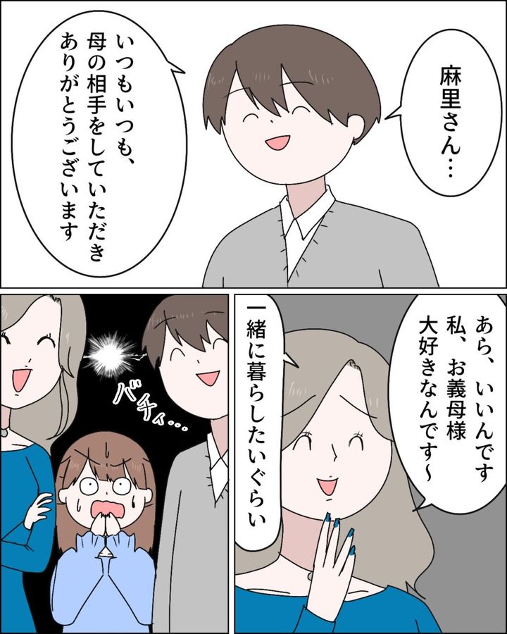 すると、「麻里さん・・いつもいつも母の相手をしていただきありがとうございます」康太がそう言うと、「あら、いいんです。私、お義母様大好きなんです~。一緒に暮らしたいぐらい」と言い出し、私の目の前で火花が散り始めました。