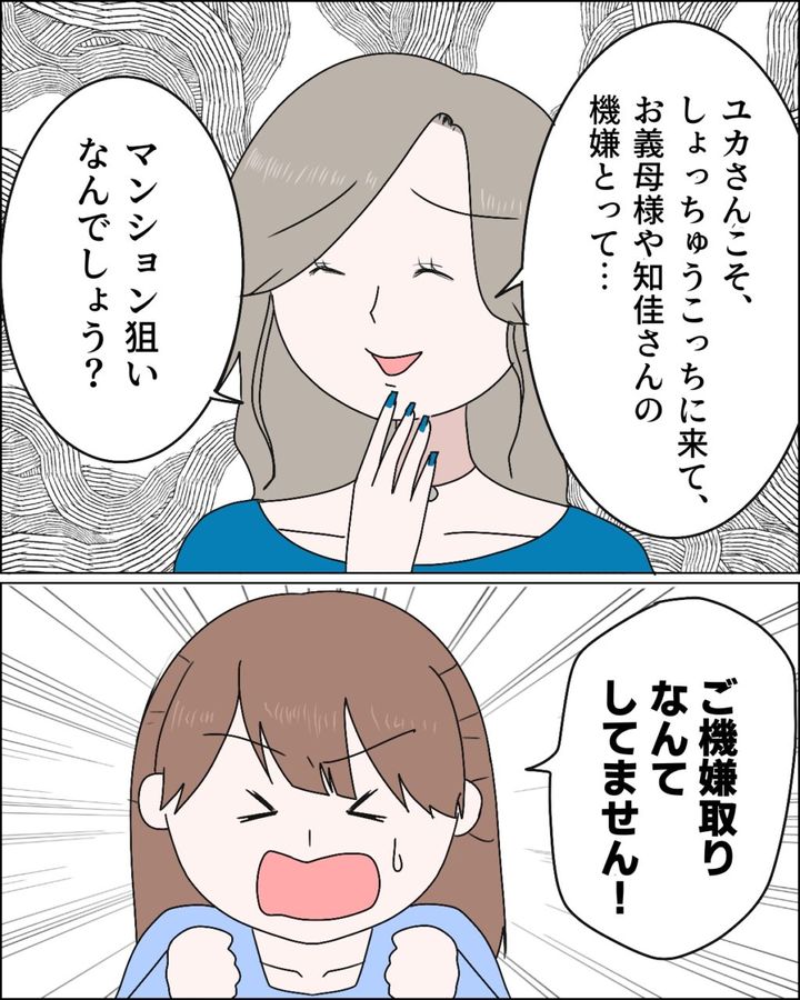 義母と知佳さんの住む義実家に、知佳さんからリクエストのあったきんぴらやたくさんのおかずを持って向かうと、ソファには我が物顔で座る麻里さんの姿が!「マンション狙いなんでしょう?」とユカに話す麻里さんに、このマンションは知佳さんの持ち物だと康太さんが宣言すると、驚いて目が点になる麻里さん、これまでの野望が打ち砕かれて、一体どういう気持ちなのでしょうか。