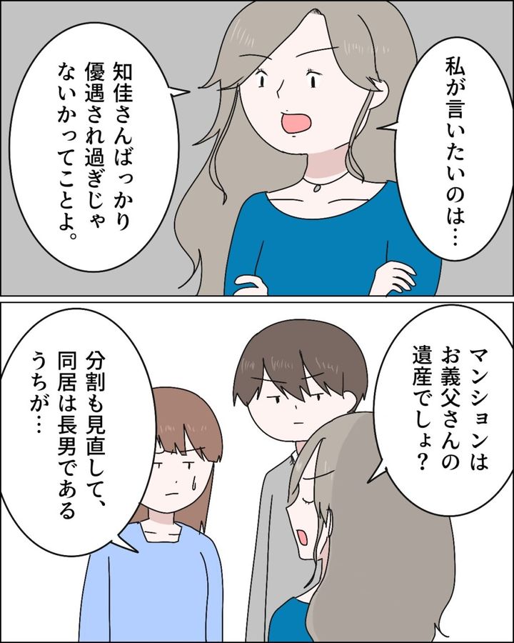 すると、「私が言いたいのは・・知佳さんばっかり優遇され過ぎじゃないかってことよ」と腕を組みながら切り出した麻里さん、「マンションはお義父さんの遺産でしょ?分割も見直して同居は長男であるうちが・・」と言い出すと、