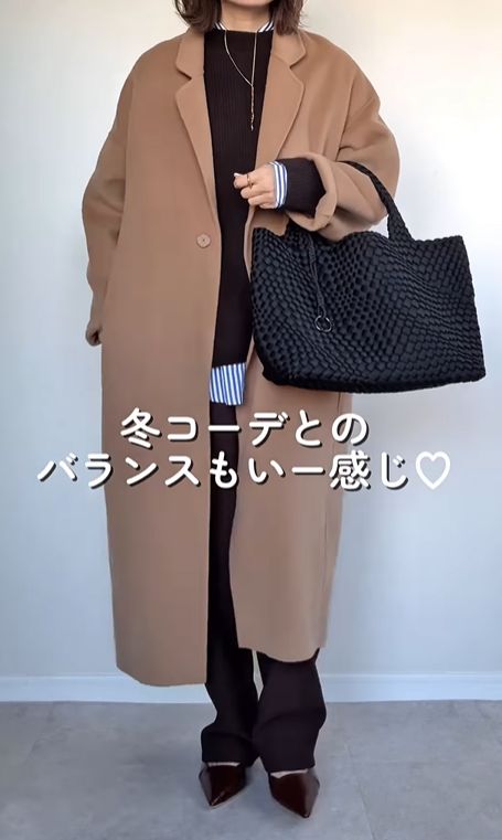 上から羽織ったキャメルカラーのロングコートが、全身にやわらかなグラデーションを生み出し、40代にふさわしい品格をプラス。足元にはシャープなポインテッドトゥのシューズを合わせ、たっぷり入る編み込みバッグを添えれば、実用性と洗練された美しさを兼ね備えた、冬のお出かけにぴったりなスタイルが完成します。