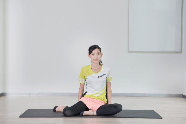 (1)体育座りをして、両脚を同方向に倒す