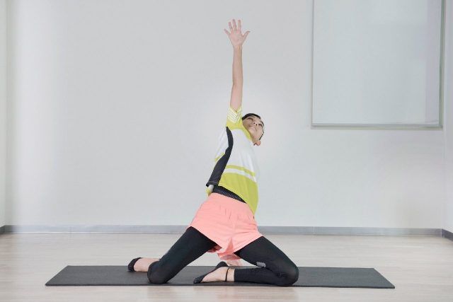 ▲鼠蹊部や下腹部が伸びていることを感じながら、目線を伸ばした腕の指先に向けます。腰が自然なカーブを描いていること、腕を天井方向にまっすぐ伸ばすことの2つに意識を向けましょう