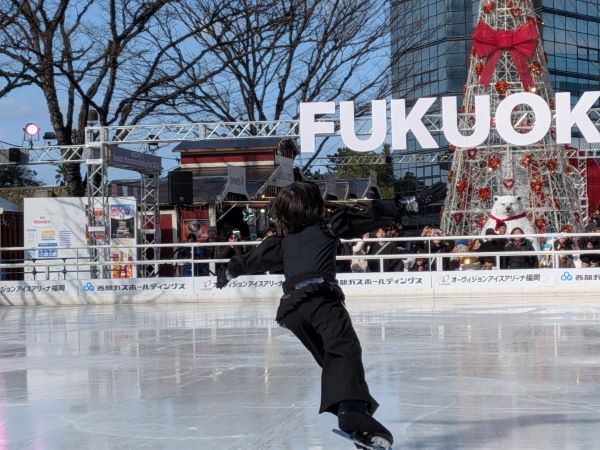 この日は運よく、福岡フィギュアアカデミーの上手なキッズスケーターによる、エキシビションが行われていました。スピン、ジャンプ、華麗な滑りに、大きな拍手が沸き上がっていました。