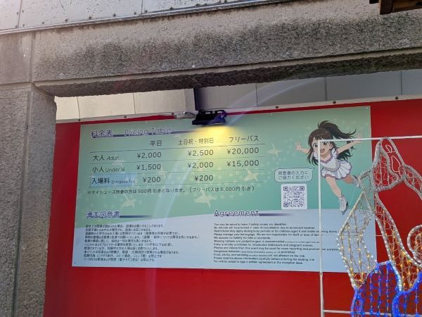 入場料は、平日:大人2000円、小人(16歳未満)1500円、土日祝日:大人2500円、小人2000円です、スケート靴代が含まれています。マイシューズ持参は500円引き、お得なフリーパスもありますよ。