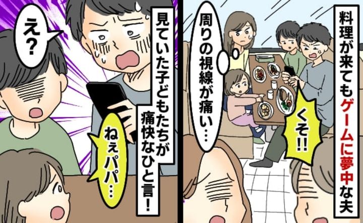 料理を前に食い入るようにスマホゲームに熱中する夫に、隣のテーブルで静かに食事している人たちが冷ややかな目線を送っているような気がして、私は落ち着かない気分に……。せっかくの料理も冷めてしまうし、なにより家族で楽しい時間を過ごせると思って外食にしたのに、ずっとゲームしている夫を見て、残念な気持ちになりました。