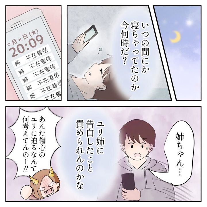 疲れが溜まっていたのか、気づけばそのまま眠ってしまっていました。今何時だろう、そう思ってスマホを確認すると、姉ちゃんから大量の不在着信が。もしかして、ユリ姉に告白したことを責められるんじゃ・・・。「あんた傷心のユリに迫るなんて何考えてんの!」そんなふうに怒鳴る姉ちゃんの姿が、はっきりと目に浮かびました。