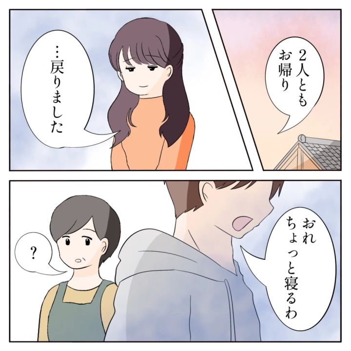 家に戻る頃には、あたりはすっかり夕暮れに染まっていました。「・・・戻りました」「おれ、ちょっと寝るわ」出かけたときとは打って変わって、元気のない様子で帰ってきた俺たち。そんな姿を見て、母さんは不思議そうに首をかしげていました。