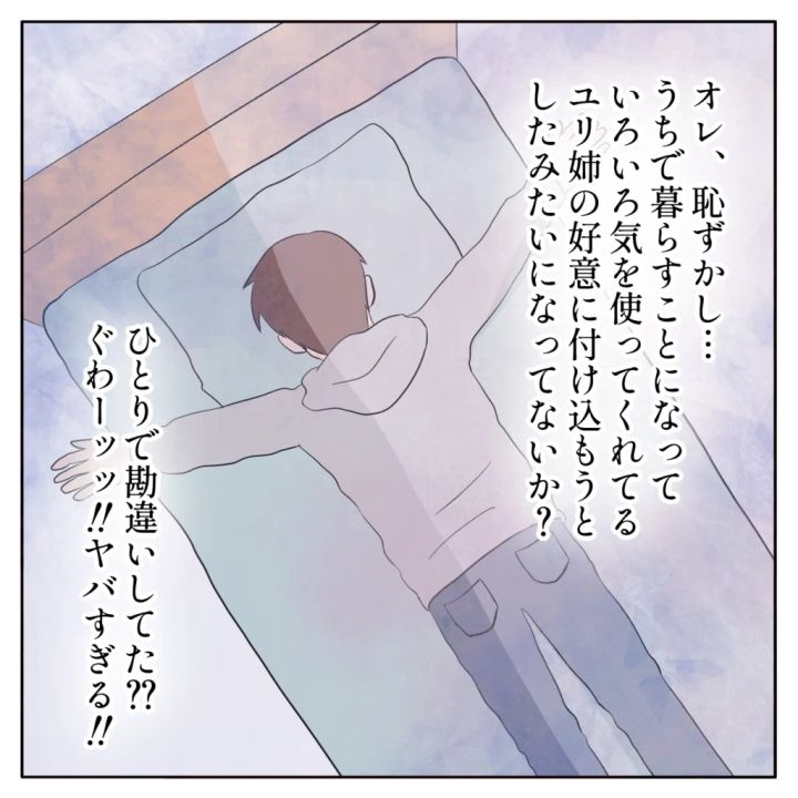 俺は、自分の言動を振り返って恥ずかしくなりました。うちで一緒に暮らすことになって、色々と気使ってくれていたユリ姉の好意につけ込もうとしたみたいになっていたんじゃないか。ユリ姉も俺のこと、いいと思ってくれてると思い込んでた。自分の軽率な行動が情けなくて、後悔せずにはいられませんでした。
