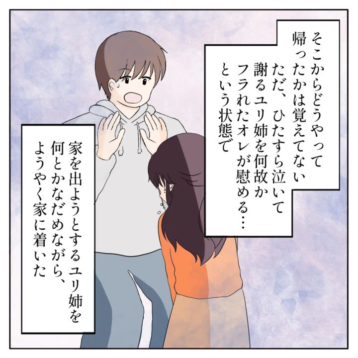 そこからどうやって帰ってきたかは覚えていません。ただ、ひたすら泣いて謝るユリ姉を、なぜかフラれた俺が慰めるという状況だったことは記憶に残っています。家を出ようとするユリ姉を必死になだめ、なんとか帰ってきました。