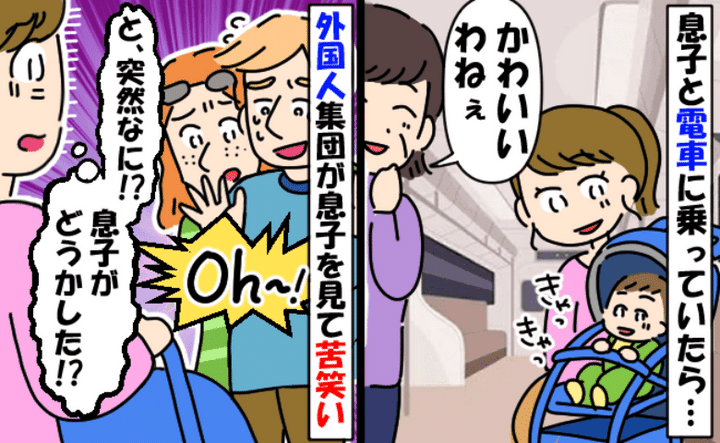 1歳の息子と電車に乗った日のことです。数人の外国人観光客が乗り合わせていましたが、息子を見て驚いた声を発し苦笑い……。嫌な予感がしてふと息子に目を向けると、息子が外国の方にまさかの行動をしていたのです……!