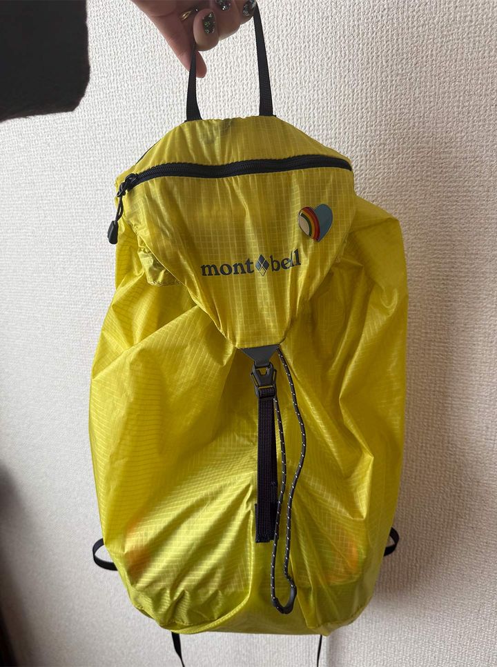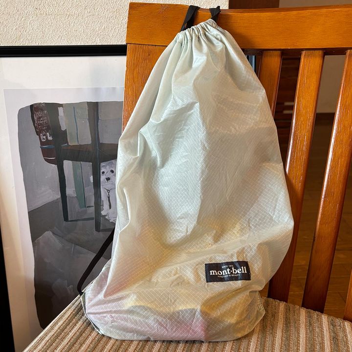 U.L.ナップサック「子どもが産まれ、最初に抱っこ紐を使ってから『モンベル』のトリコに♡ ライトグレーのナップサックは、とにかく軽くて内側のポケットにすべて収まるポケッタブル仕様。エコバック感覚で気軽に持ち歩けます。バッグに忍ばせておいて、少し暑くなったときにマフラーや脱いだ上着を入れるのにもぴったりなアイテム!」