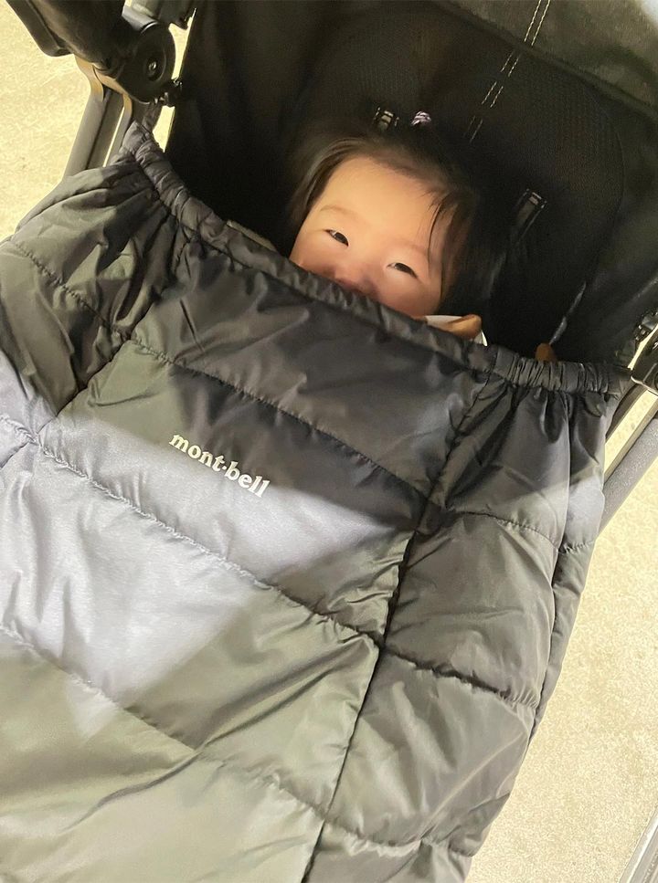 ポケッタブル ベビーキャリア ウォーマー「ベビーカーに付けたり、抱っこ紐に付けたりと、寒い時期の必需品。今は自転車に乗るときの防寒アイテムとしても使っていて、赤ちゃん期からずっと愛用しています。使わないときはコンパクトに畳めるのも魅力。ポケット付きで、抱っこ紐だけで“ちょっとそこまで”のお出かけにも便利です。分厚すぎないので体温調整もしやすいのが嬉しいポイント。『モンベル』愛用歴は約10年。もともとはアウトドア用品をメインに使っていましたが、実は子育てグッズや普段使いできるアイテムも豊富で、本当に頼れるブランドです」