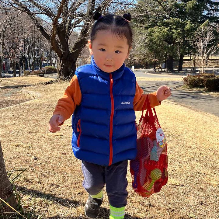 「発色のよさが魅力のベスト。軽くて着心地がよく、子ども自身もお気に入りです。気温調節が難しい春や秋に活躍してくれるのが嬉しいポイント。暑くなったら小さく畳んで付属のポーチに収納でき、持ち運びにも便利です。『モンベル』はハイクオリティなのに買いやすい値段で、デザインも大好き! 家族でお揃いできるのもいいですよね」
