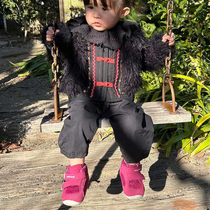 ベビーブーツ「娘が生まれてから買うようになった『モンベル』。丈夫で長く使えるうえ、カラー展開が可愛く、つい手に取ってしまいます。ベビーブーツは、ピンクのカラーがとにかく可愛い♡ 足をしっかりホールドしてくれるので、つまずきにくく歩きやすそうです。登園用の靴としても、普段の公園遊びにも活躍しています」