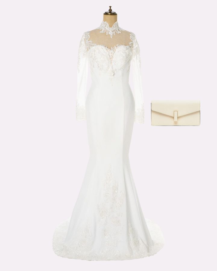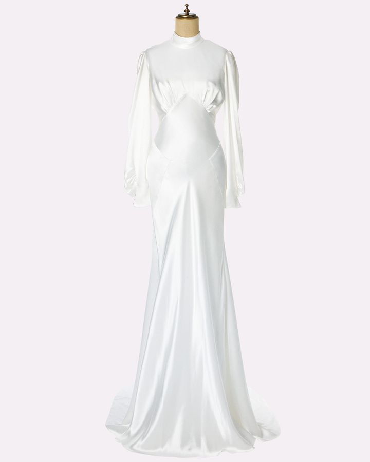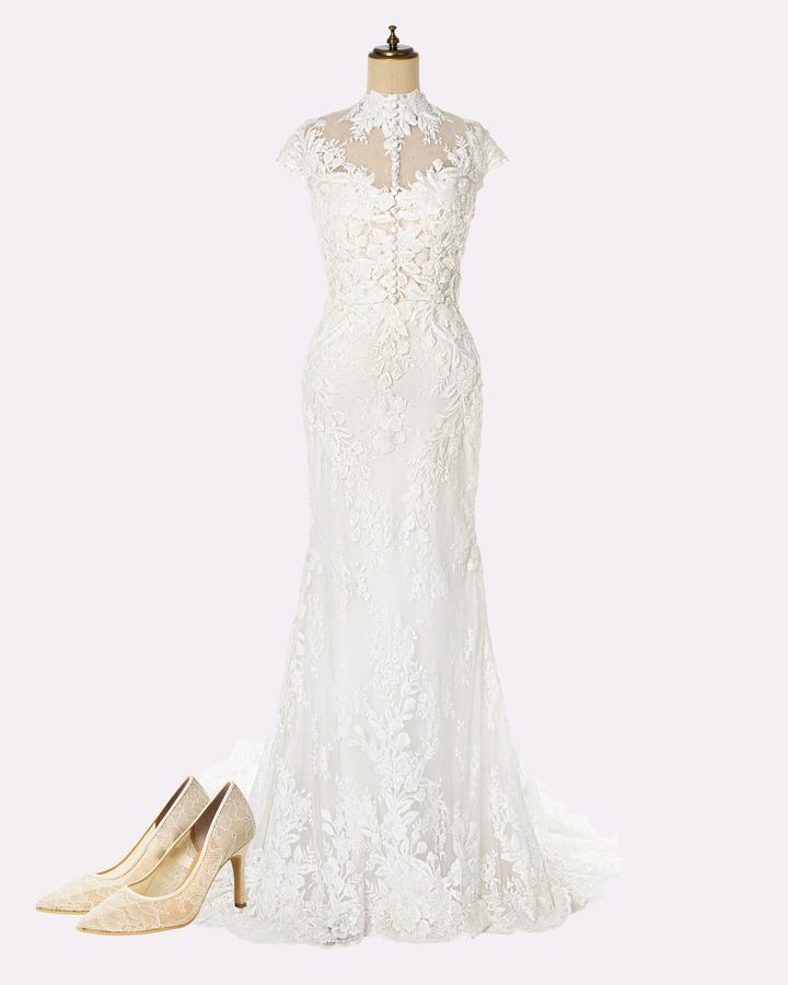 神聖なスタンドカラーのオープンバックドレス。フランスの希少なアランソンレースを使用。