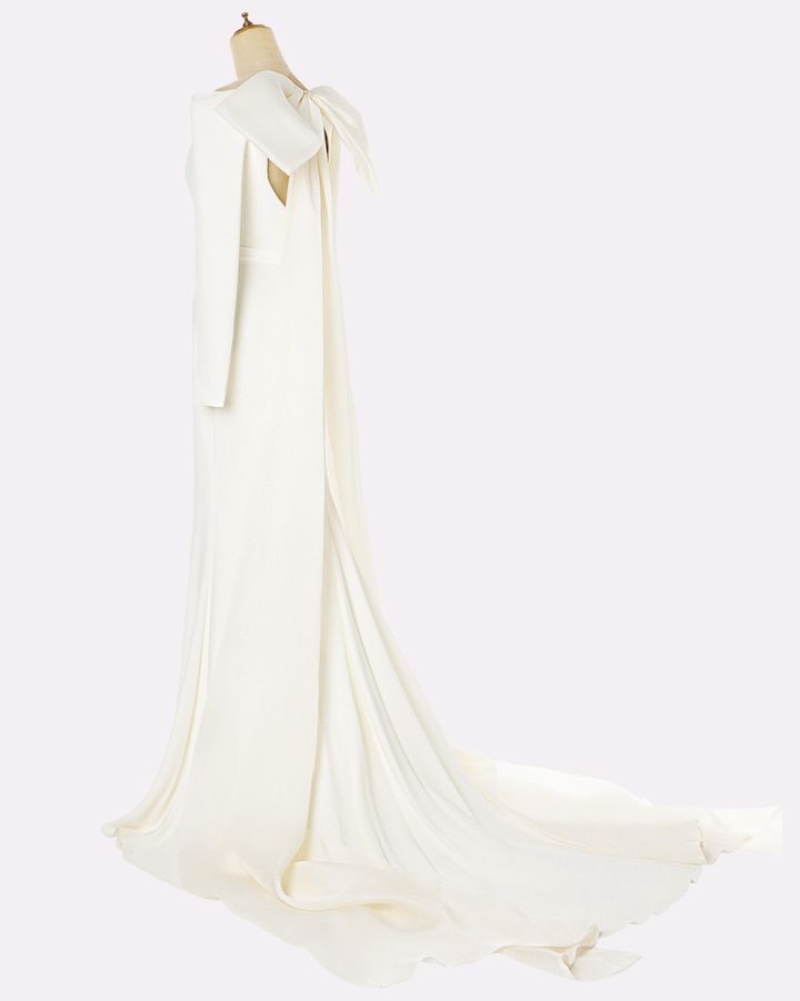 英国のデザイナーによる一着は、ブランドが得意とする、素材の特性を生かしたドレーピーなデザイン。ビッグリボンが大人の甘さを表現。