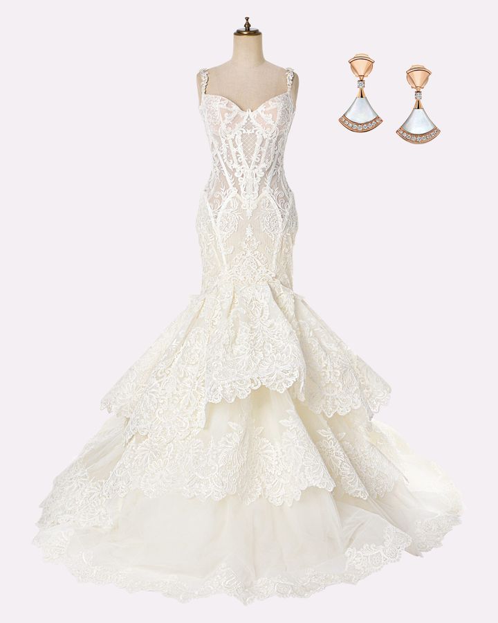 ドレス¥770,000[レンタル価格](ガリア・ラハヴ /マグノリア・ホワイト 表参道 tel.03-6434-1313) ピアス"ディーヴァ ドリーム"[PG×ダイヤモンド×マザーオブパール]¥781,000(ブルガリ/ブルガリ・ジャパン tel.0120-030-142)