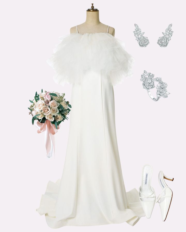 バックスタイルのトレーンも美しい、流麗なクレープ素材のスレンダードレス。ボリューミーなチュールのストラップ付きケープが、今のエフォートレスな優雅さを表現。バラのジュエリーとブーケをアクセントに。