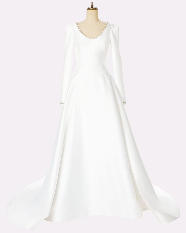 品性を高めてくれる、控えめな肌見せのロングスリーブ。ミカドシルクの上質な質感が際立つ、シンプルなAライン。襟ぐりと袖口のビジューがアクセント。