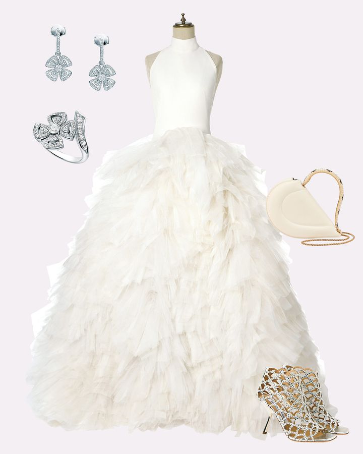 ドレス¥1,127,500[レンタル価格](リーム・アクラ/ドレスモア tel.06-6266-0069)"フィオレヴァー"[WG×ダイヤモンド]ピアス¥2,783,000 リング¥2,189,000 バッグ[W18×H11×D4]¥627,000(すべてブルガリ/ブルガリ・ジャパン tel.0120-030-142) 靴[H10]¥292,600(セルジオ ロッシ/セルジオ ロッシ ジャパン カスタマーサービス tel.0570-016600)