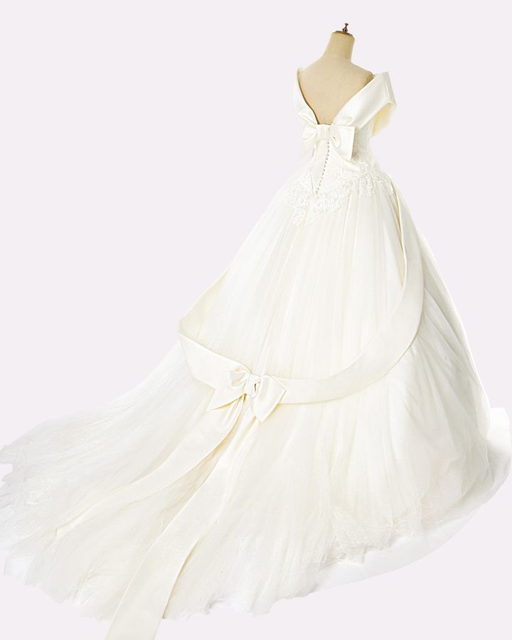 ウエストとロングトレーンに飾られた2つのリボン。ミカドサテンとチュールを重ねた素材も相まって、ロマンチックなプリンセス気分に。