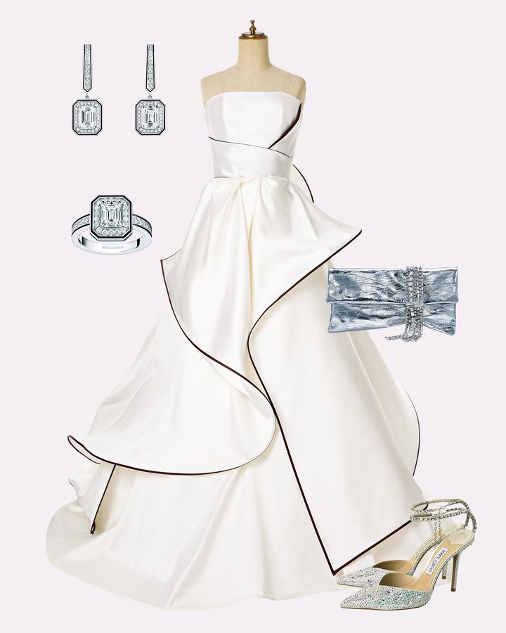 ドレス¥605,000[レンタル価格](アントニオ・リーヴァ/ミーチェ tel.03-5475-5120) "ヴァンドーム リズレ"ピアス[WG×ダイヤモンド]¥10,428,000 リング[WG×ダイヤモンド、センター0.5ct]¥4,712,400[2点共参考価格](2点共ブシュロン/ブシュロン クライアントサービス tel.0120-23-0441) バッグ[W30×H15.5×D2.5]¥213,400 靴[H10]¥312,400(2点共ジミー チュウ tel.0120-013-700)