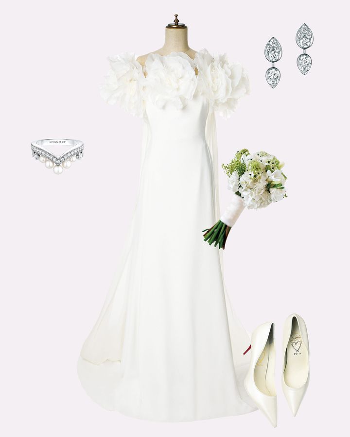 ドレス ¥330,000[レンタル価格](エー バイ ハツコ エンドウ/ハツコ エンドウ ウェディングス 銀座 tel.03-3563-1411) "ピアジェ ローズ"[WG×ダイヤモンド]イヤリング ¥5,544,000 リング ¥4,400,000(2点共ピアジェ/ピアジェ コンタクトセンター tel.0120-73-1874) 靴[H7]¥174,900(マノロ ブラニク/ブルーベル・ジャパン tel.03-5413-1050)
