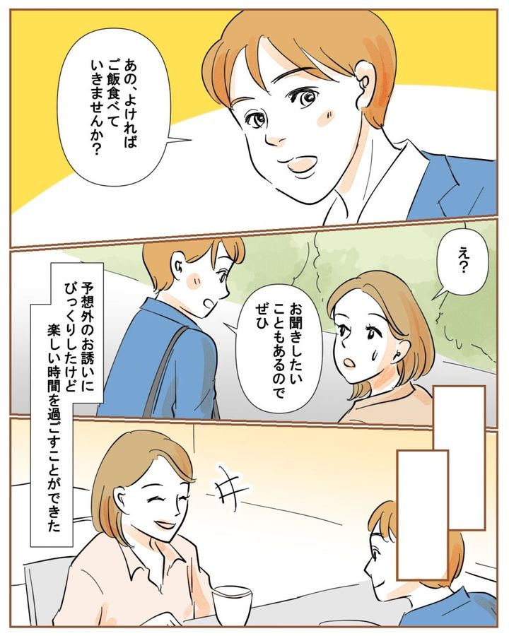 「あの、よければご飯食べていきませんか?」と佐藤さんが言いました。思わぬお誘いに「え?」と驚いていると「お聞きしたいこともあるので、ぜひ」と言われ、予定もなかったので一緒にご飯を食べに行くことにしました。予想外のお誘いにびっくりしましたが、楽しい時間を過ごすことができました。これまであまり接点がなかった佐藤さんですが、とても話しやすい人でした。