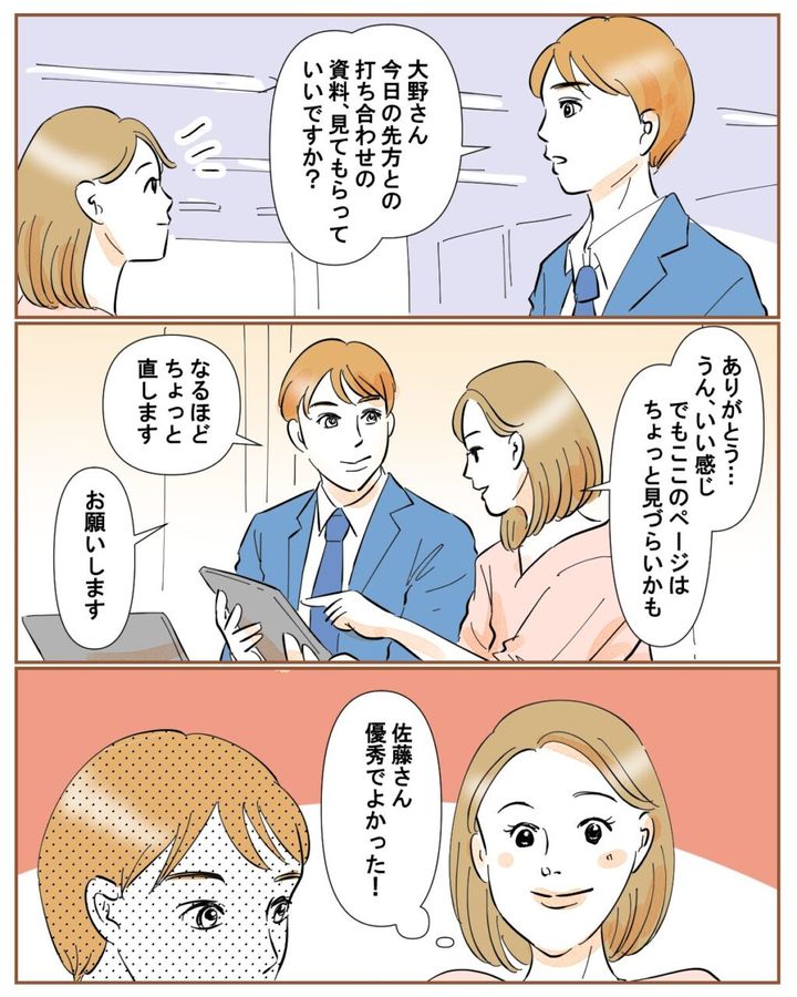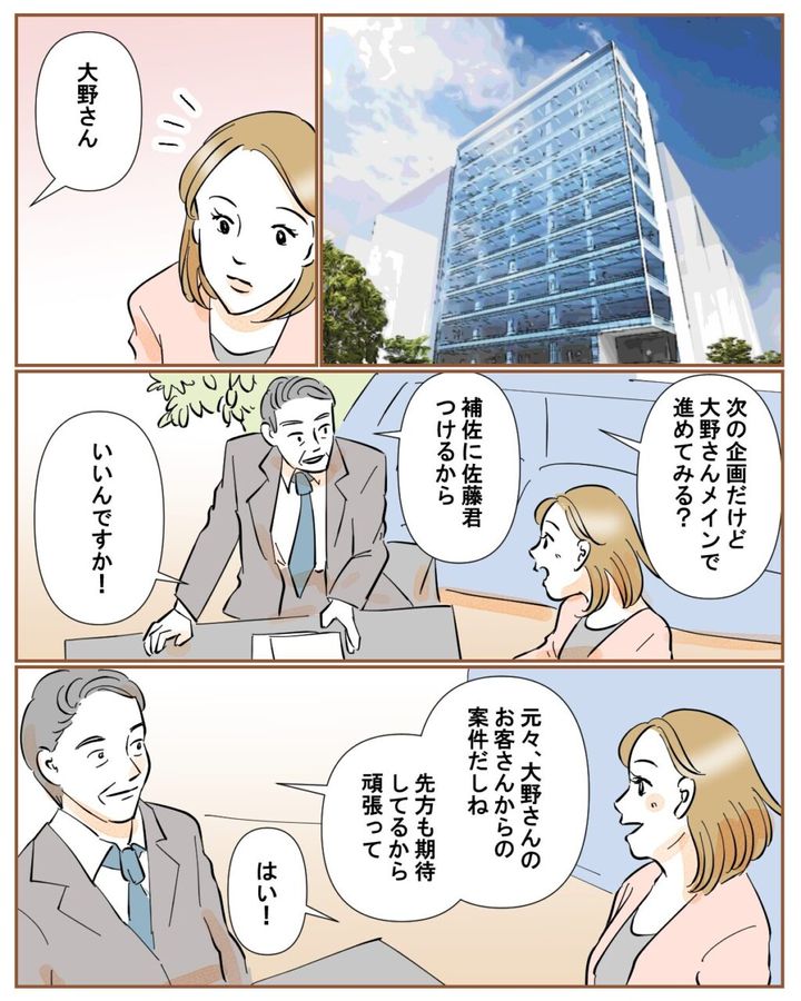 それからしばらくして、会社で上司に呼ばれた私は「次の企画だけど、大野さんメインで進めてみる?補佐に佐藤君つけるから」と新しい案件のメインを打診されました。「先方も期待してるから頑張って」と言ってもらえ、自分がこれまでやってきたことが評価されたことをとても嬉しく思いました。