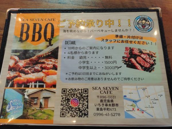 「SEA SEVEN CAFE」さん、ランチやカフェの他にも3日前からの予約でバーベキューもできちゃいます。海を見ながらのバーベキュー。準備や片付けもいらないのでお手軽バーベキューを絶景の場所で楽しむのもいいですね~。ご予約お問い合わせは公式ラインかインスタグラムを確認してみてください。