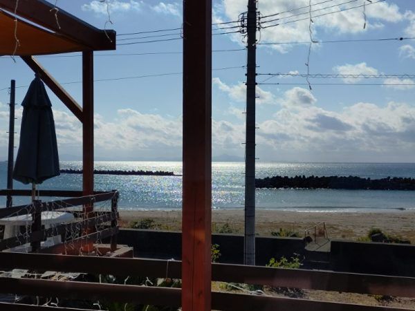 外観や店内もとってもおしゃれ。テラスもあって波の音が聞こえてすごく落ち着けそう。店内も窓が大きくてインテリアも統一されています。海が目の前のカウンター席とテーブル席がありました。