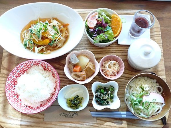 そしてメインの他にも、汁物にうどんorそば、果物付きのサラダ、茶碗蒸し、お漬物も併せて小鉢が四種。小鉢もそれぞれ丁寧に作られていてすごくおいしい。それに、なんとミニぜんざい付き。甘味まで嬉しい~。
