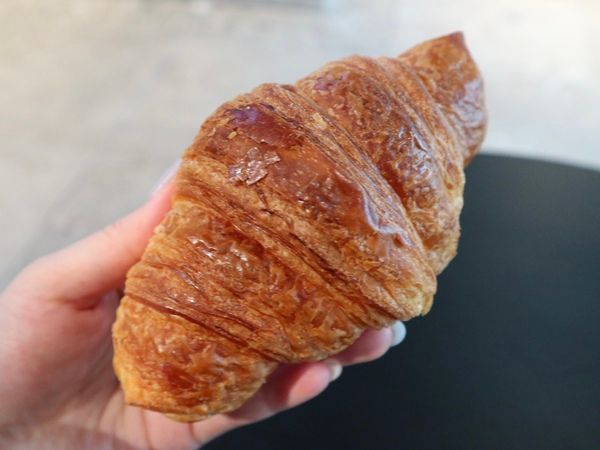 香ばしい焼き色のクロワッサンからいただきます。袋から取り出す際に生地がほんのりこぼれ、ふわりバターが香ります。