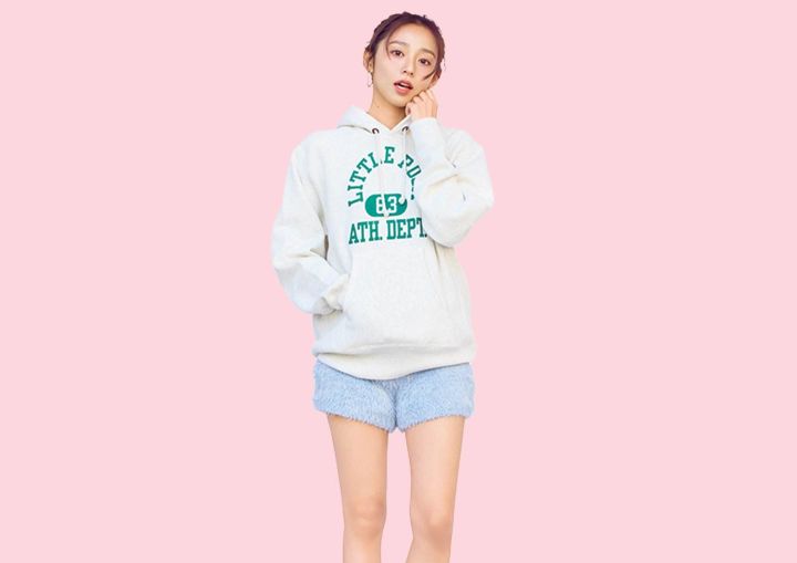 パーカ¥12,980/チャンピオン(ヘインズブランズ ジャパン) ショートパンツ¥6,380/SNIDEL HOME ルミネ新宿2店 ピアス¥3,080/アネモネ(サンポークリエイト) ソックス¥1,375/靴下屋(タビオ)
