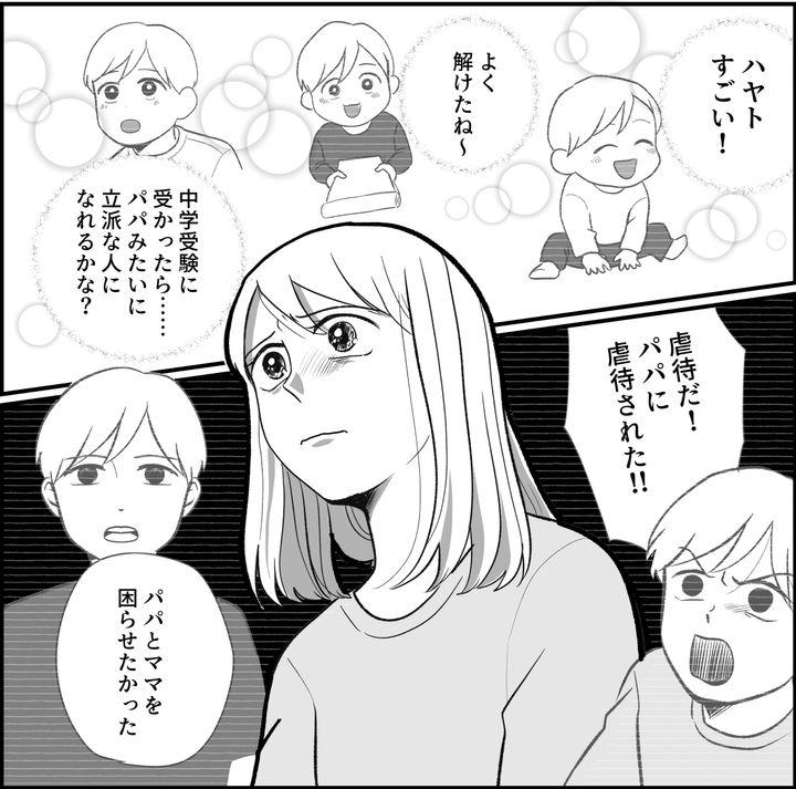 私(アイ)は夫のマサヒロと、2人の息子ハヤトとダイチの4人家族です。私たちはハヤトが希望するA中学に入れるように、家族総出で必死のサポートを始めたのでした。そんなある日、事件が起こるのです。感情が爆発してしまったハヤトは、ダイチのパズルを壊しながら、家の中のものに当たり散らし始めます。力ずくでハヤトを制止させた夫に対し「虐待だ」と言い始めたハヤト。そして警察に通報してしまうのでした。その後訪れた父の日、ハヤトは「父の日のプレゼントを買いに行く」と嘘をついて、夫の財布から1万円を盗み、遊びに行っていたことが発覚してしまうのでした。私はもう、何を信じていいのか分かりませんでした。ただ目の前にいるハヤトが、私の知っているハヤトではないことだけはハッキリしていました。