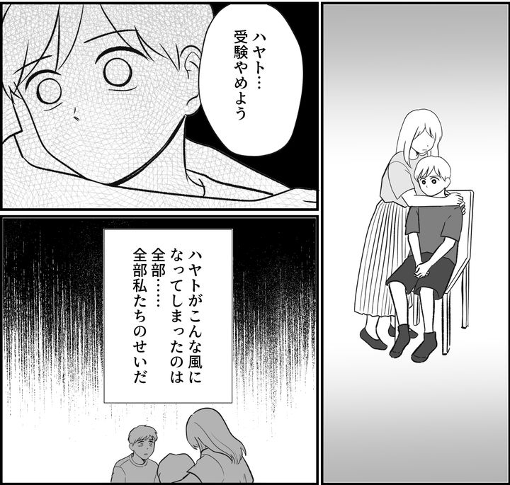 苦しくなって小さなSOSを私たちに何度も送っていたハヤト。そのハヤトの変化に私たちは気が付かなかった。いや、気付こうとしなかった。私たちはいつも、ハヤト自身をテストの点数だけで評価していたのです。私の目から涙が溢れていることにハヤトが気付きました。私はハヤトを抱きしめて言いました。