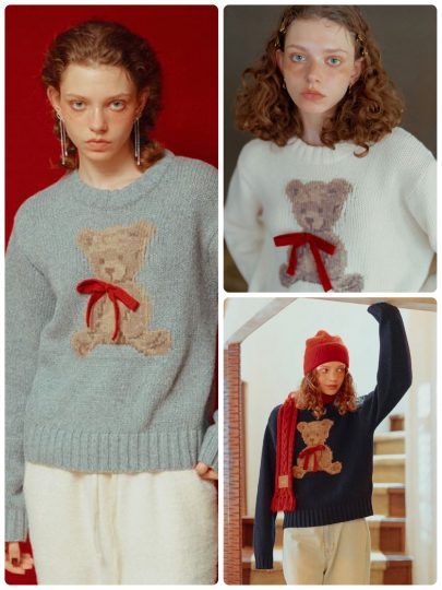 ぬくもりを感じさせるベアモチーフが目を引くニット。立体感のある赤いリボンが、さりげなくもフェミニンなポイントを添えています。