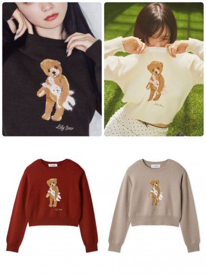 LILY BROWNのアイコンでもあるLily Bearが、大きくてふわふわなウサギのぬいぐるみを抱えて登場しました。春先までご着用いただける厚すぎないニットで、ジャケットやアウターの中にも着やすい仕上がりです。