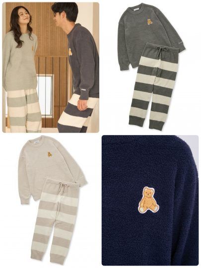 ジェラート ピケ オムのセットアップ。ふんわりと柔らかい素材で寒い冬も頼れます。胸元のワンポイントのベアがキュートなアクセント。パートナーとのシェアやおそろい、ギフトにもオススメです。